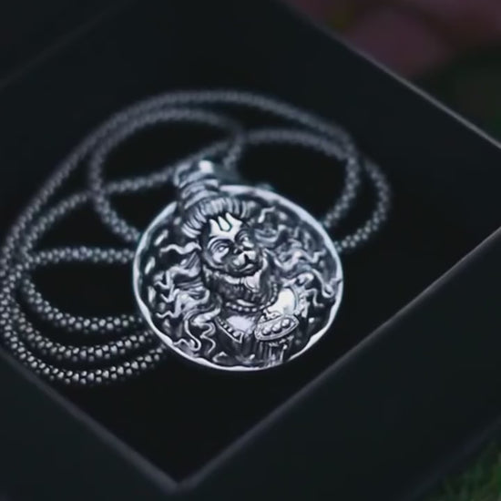The pendant features a highly detailed 3D carving of Lord Hanuman, symbolizing power, protection, and devotion. The oxidised finish enhances every contour of the design, giving it an antique yet royal appearance. Paired with a sturdy and premium-quality silver-toned chain, this piece is perfect for everyday wear or special occasions.